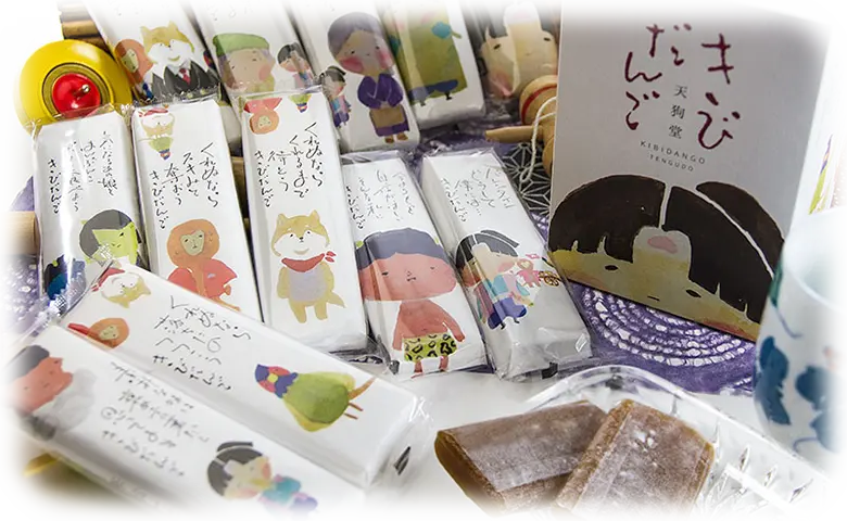 当社きびだんごのルーツとも 言える「日本一きびだんご」は、桃太郎の【ともに戦い、分け合う】という物語の力に託し命名しました。