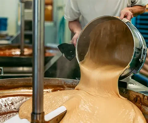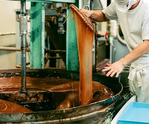 [きびだんご攪拌鍋]で餅粉や砂糖、水飴などの原材料を混ぜ合わせます。