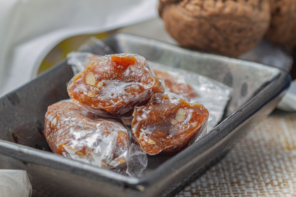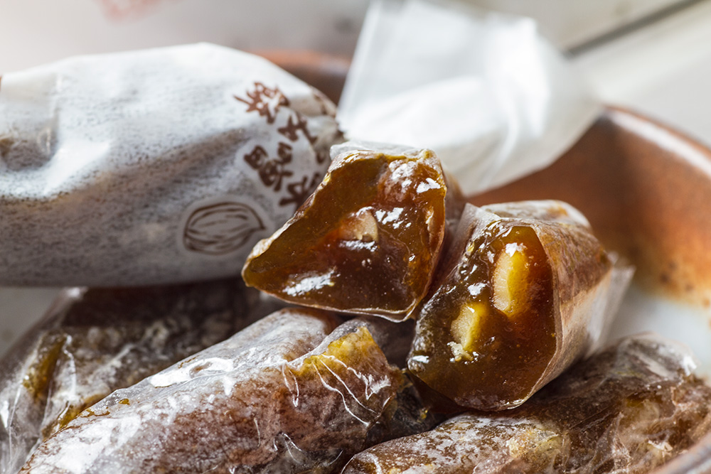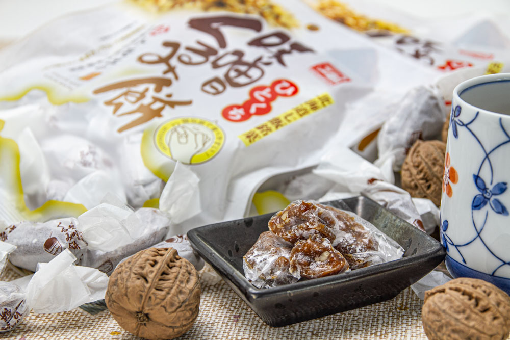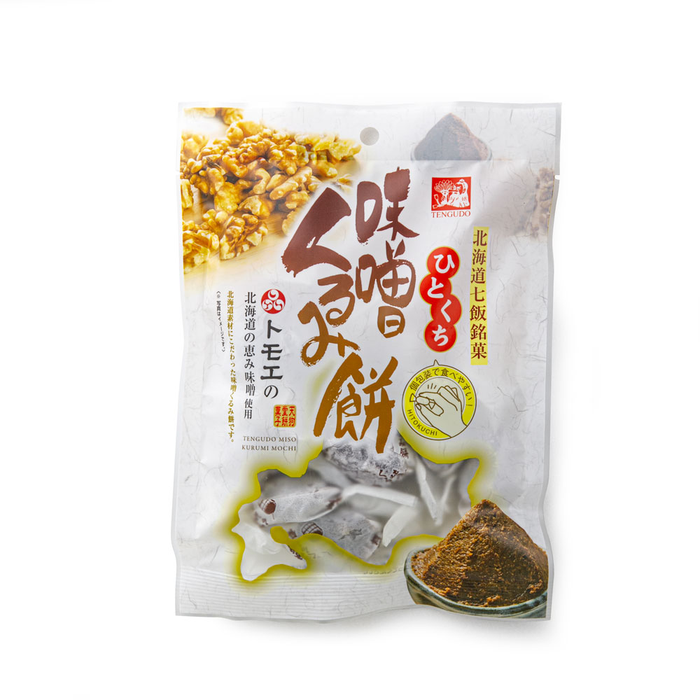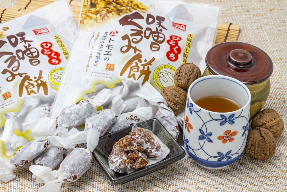 トモエ北海道の恵み味噌の香ばしい風味と、くるみのカリッとした食感が味わえる一口サイズの餅菓子です。