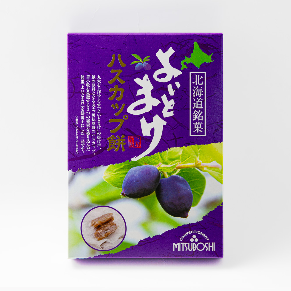北海道苫小牧市(株)三星の銘菓「よいとまけ」を餅菓子にしました。もちもちした食感とハスカップのほどよい酸味が味わえる北海道ならではの餅菓子です。